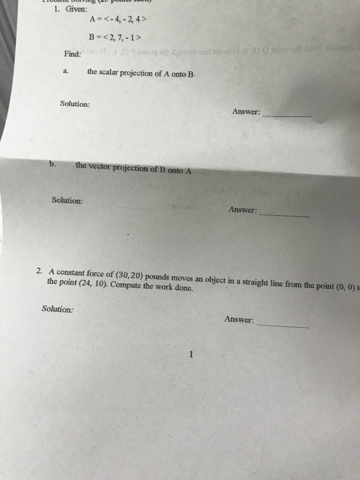 Find The Scalar And Vector Projections Of B Onto A. . Math 210, Quiz 1 (9/7/04) (1) Find The Scalar And Vector ...